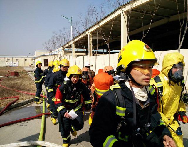 洛陽(yáng)市消防支隊(duì)王榮范參謀長(zhǎng)、西工區(qū)消防大隊(duì)劉學(xué)康大隊(duì)長(zhǎng)及洛陽(yáng)正大總裁辦喬光斌總經(jīng)理、食品事業(yè)部杜光輝副總經(jīng)理一行在演練前到達(dá)演練場(chǎng)地進(jìn)行安排部署,成立了消防演練現(xiàn)場(chǎng)指揮部,由洛陽(yáng)市消防支隊(duì)王榮范參謀長(zhǎng)任指揮長(zhǎng)。演練假設(shè)正大食品有限公司制冷機(jī)房因設(shè)備發(fā)生故障,液氨罐發(fā)生泄漏,1名操作人員受困,現(xiàn)場(chǎng)人員立即向公司領(lǐng)導(dǎo)匯報(bào)并撥打119尋求支援。119指揮中心在接到報(bào)警后,由洛陽(yáng)市消防支隊(duì)協(xié)調(diào),迅速調(diào)集澗西消防大隊(duì)下屬谷水中隊(duì),西工區(qū)消防大隊(duì)下屬車站中隊(duì)、紅山中隊(duì)迅速趕赴現(xiàn)場(chǎng),與此同時(shí)正大食品有限公司迅速啟動(dòng)單位應(yīng)急預(yù)案,組織員工疏散。十五分鐘后,紅山消防中隊(duì)6臺(tái)消防車、2臺(tái)救護(hù)車到達(dá)現(xiàn)場(chǎng),消防戰(zhàn)士著防化服立即進(jìn)入現(xiàn)場(chǎng),對(duì)氨中毒人員進(jìn)行搶救,對(duì)氨泄漏部位進(jìn)行應(yīng)急處置。二十分鐘后谷水中隊(duì)、車站中隊(duì)6臺(tái)消防車達(dá)到現(xiàn)場(chǎng)支援, 50余名消防員展開(kāi)救援戰(zhàn)斗,用消防水槍噴水中和泄漏的氨氣,降低空氣中氨的濃度。經(jīng)過(guò)近一個(gè)小時(shí)的搶維修,氨泄漏得到控制,演練指揮中心宣布本次演練***結(jié)束。