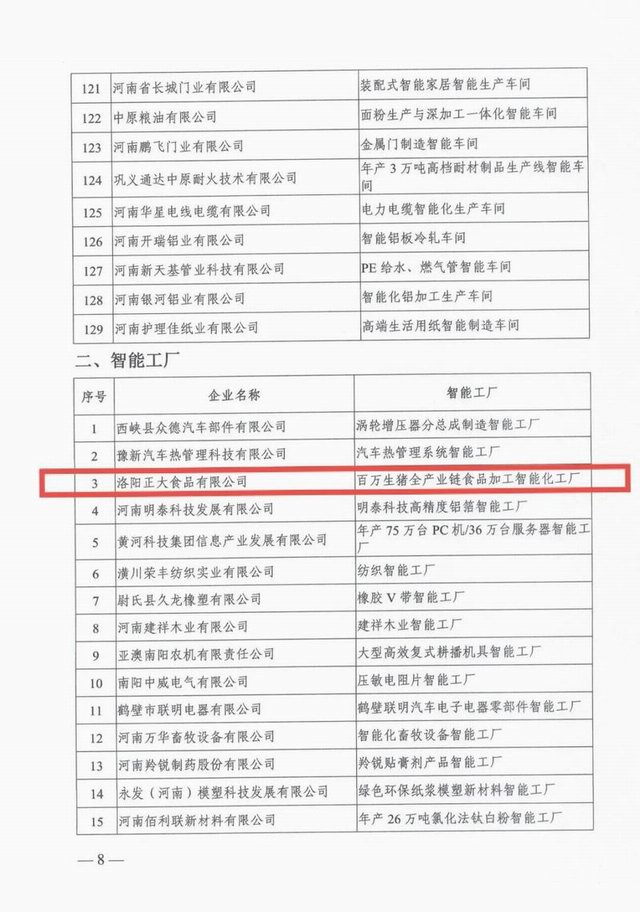 按照《河南省工業(yè)和信息化廳辦公室關(guān)于開展2021年度河南省智能車間智能工廠申報(bào)工作的通知》(豫工信辦產(chǎn)融〔2021〕163號(hào)),經(jīng)企業(yè)志愿申報(bào)、各地工業(yè)和信息化主管部門初審和現(xiàn)場(chǎng)核查、省工業(yè)和信息化廳組織專家評(píng)審、網(wǎng)上公示,河南省工業(yè)和信息化廳確定129個(gè)智能車間為2021年河南省智能車間、34個(gè)智能工廠為2021年河南省智能工廠。2021年10月27日,河南省工業(yè)和信息化廳辦公室下發(fā)文件《河南省工業(yè)和信息化廳辦公室關(guān)于印發(fā)2021年河南省智能車間智能工廠名單的通知》(豫工信辦產(chǎn)融【2021】195號(hào))予以公布。洛陽正大獲評(píng)2021年河南省智能工廠!
